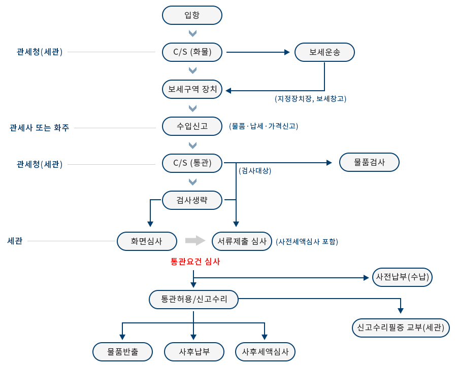 수입통관이라 함은 수입하고자 하는 자가 우리나라에 수입될 물품을 세관장에게 수입신고 하고, 세관장은 수입신고가 관세법 및 기타 법령에 따라 적법하고
